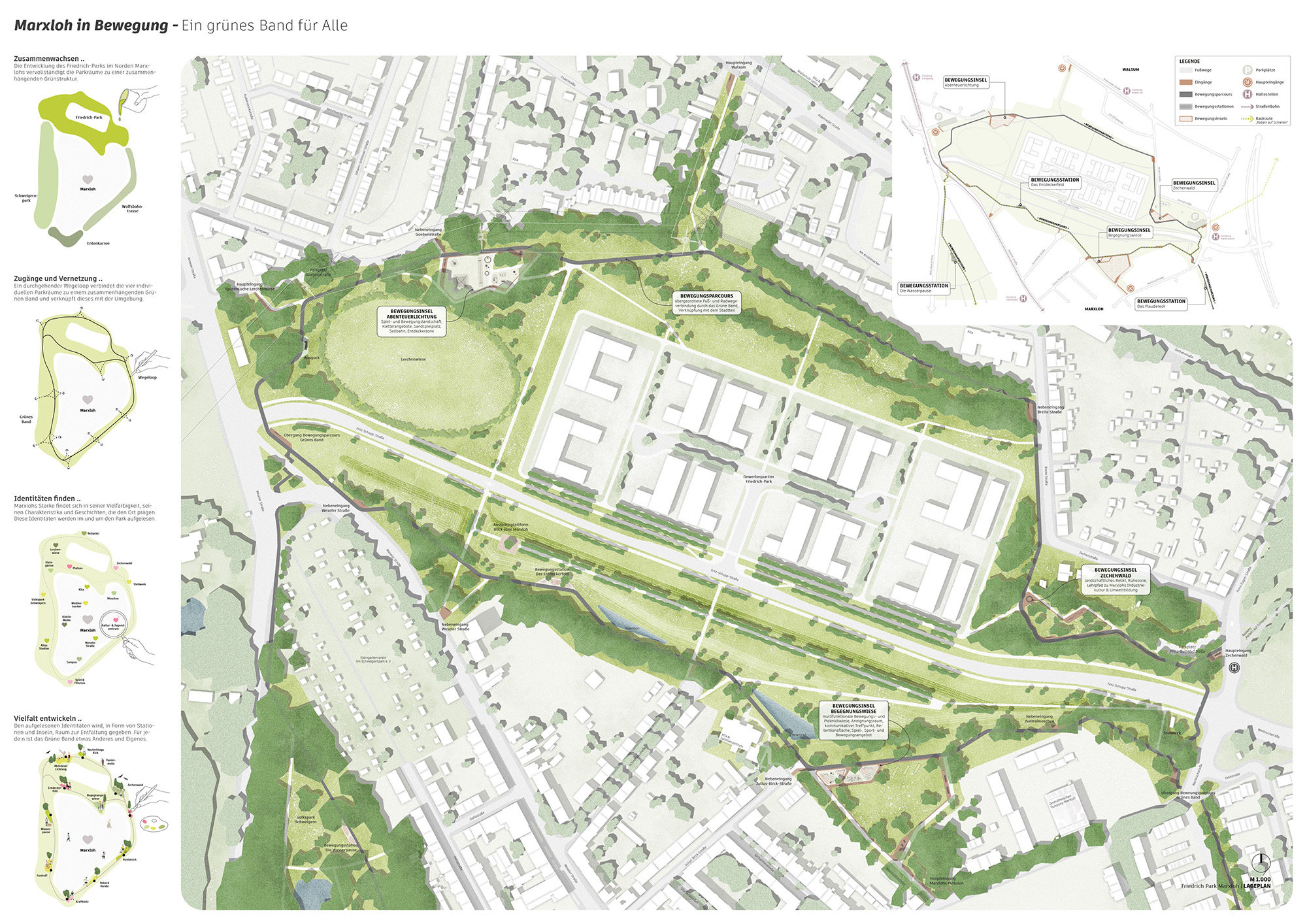 Ziel der Planung ist es, die fragmentierten Bereiche in einen Kontext zu setzen und diese entgegen einer weiteren Überformung des Areals sensibel weiterzuentwickeln. Der Bewegungsparcours schafft den übergeordneten Rahmen des Friedrich-Parks und führt ihn künftig thematisch zusammen. Mehrere Eingänge dienen als Trittsteine aus den Nachbarschaften auf den umlaufenden Wegeloop.