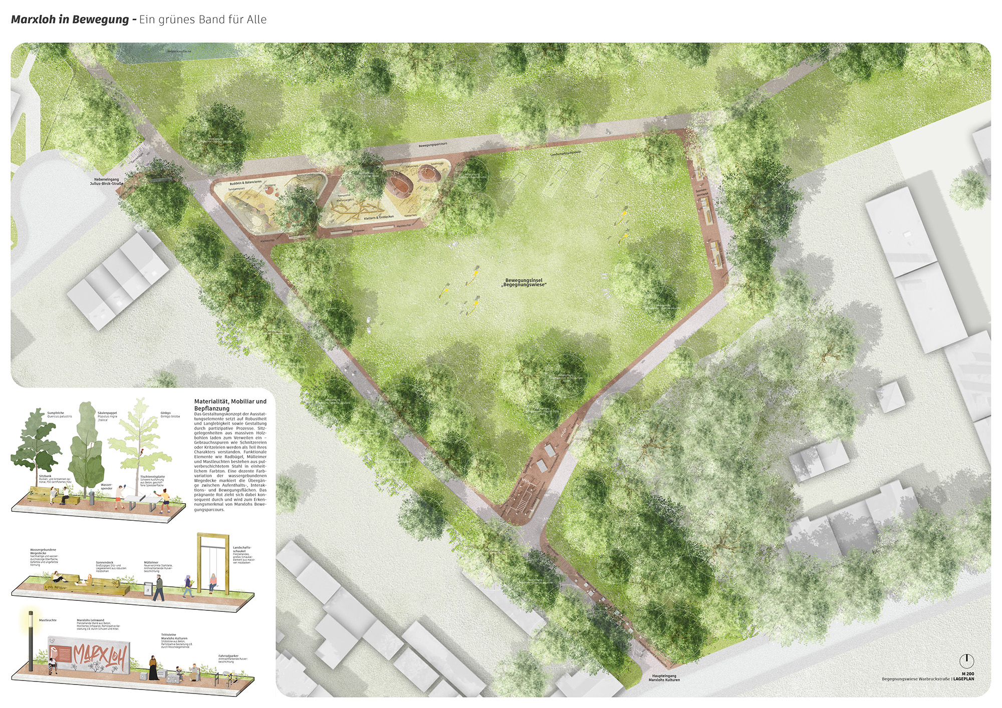 Zudem sind sie durch den ÖPNV und MIV ideal angebunden. Die Gestaltung der Eingänge durch eine rotkörnige wassergebundene Wegedecke wird zum wiederkehrenden Erkennungsmerkmal im Friedrich-Park. Aufweitungen der Wege a den Eingängen schaffen darüber hinaus offene, einladende Räume, die zum Verweilen, Beobachten und Begegnen anregen. Jeder Eingang erhält eigene identitätsstiftende Elemente, die im Zusammenhang mit dessen stehen. Zusätzliche Informationsstelen fördern die Orientierung im Park. Die rote Oberflächengestaltung überträgt sich auf die Bewegungsinseln und ‑stationen, die den Bewegungsparcours weiter aufladen. Die Bewegungsinseln konzentrieren sich auf Bereiche, die bereits von den Anwohnenden angenommen werden, Entwicklungspotential bieten und den positiven Wandel im Stadtteil sichtbar machen.